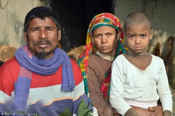 Единственная часть тела, не затронутая болезнью, это лицо и небольшой участок на груди. Болезнь у мальчика появилась с рождения. Мать и бабушка с тех пор призывают окружение помочь мальчику, но пока все тщетно.
