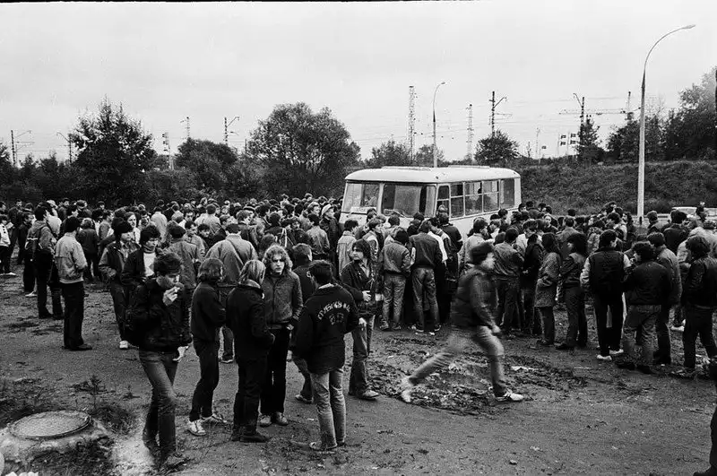 Перенесемся в прошлое. Фотография датируется 10-ым сентября 1987-го года. Снимок сделан возле станции метро «Ленино». Сегодня она именуется «Царицыно». Из автобуса продают билеты на фестиваль. Справедливости ради и сегодня крупные фестивали вызывают похожий ажиотаж. На том же «Нашествии» или «Максидроме» собирается народу куда больше чем в Подольске, но и рекламы сегодня намного больше.