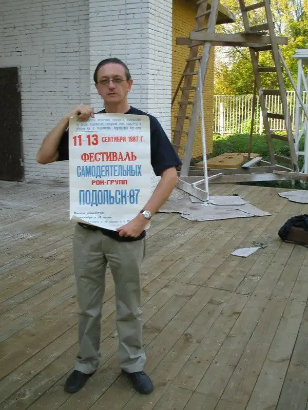 Еще одна сохранившаяся афиша. Держит её Пётр Колупаев. Тогдашний президент подольского рок клуба. Как я писал выше, не знаю, чем он занимается сегодня. 5 лет назад вроде бы проводил концерт посвящённый юбилею фестиваля в Подольске. Правда мероприятия проходили в одном из московских клубов и там играли второстепенные группы.