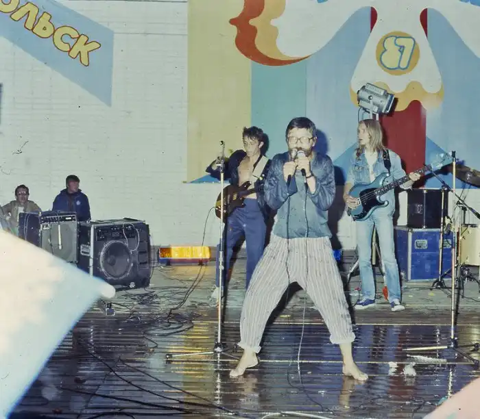 Но вернёмся в прошлое. На сцене фотограф запечатлел группу «Облачный край». Их же гитарист Сергей Богаев стоит на заглавной фотографии поста. Это группа из Архангельска, пожалуй, единственная кто стал оттуда по-настоящему известен в 80-е. Ныне они практически полностью забыты. К слову на этом фестивале Богаев разбил свою гитару «Урал» во время выступления. Насколько мне известно, это первый случай вандализма на сцене в нашей стране. Люди хотя бы косвенно имеющие отношение к музыке при слове «Урал» наверняка скривят лицо. А зря. По воспоминаниям современников Богаев умудрялся извлекать из неё такую музыку, которую многим не по силам извлечь сегодня и из дорогих «Фендеров». Правда, играть он предпочитал после принятия изрядной доли алкоголя, что лично для меня удивительно. В интернете есть информация, что манера игры Богаева оказала влияние на гитариста группы «Rammstein». Не знаю, правда ли это или нет. До наших дней Сергей Богаев не дожил. Его не стало в 2011-ом году.