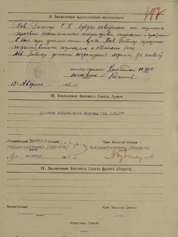 Семьдесять лет назад при обороне высоты 174,5 Тираспольского укреп. района Семен Константинович огнем пулемета уничтожил более сотни военнослужащих Вермахта. Израсходовав боезапас, получив ранение и оказавшись впоследствии в окружении, красноармеец не бросив оружия, преодолев более 10 километров, вышел к своим. Что и подтверждается наградным листом от 19 августа 1941 года. Подвиг красноармейца Гитлера тянул по статуту на "Красную звезду", но вытянул только на "Отвагу". Фамилия помешала? Хотя в начале войны награждали с большим скрипом и "За Отвагу!" 41-ого года стоит ордена редакции 45-ого.