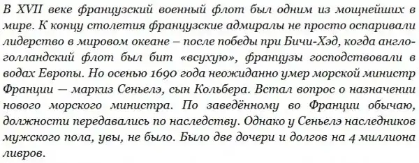 Можно ли сказать, что Поншартрен был дурак? Отнюдь нет. Он думал о будущем, о том моменте, когда пост морского министра - по наследству - перейдёт к его сыну. Как грустно заметил в своём меморандуме на королевское имя вышеупомянутый Бонрепо, "Главная причина его согласия на это предложение заключается в намерении передать свою должность сыну. Это естественно привело его к заключению, что если флот будет оставаться на прежнем уровне, необходимом для государства, Ваше Величество, возможно, сочтет его сына неспособным для занятия такой важной должности; но с другой стороны, если флот будет сведен до пустого места, Вы, Ваше Величество, возможно, будете более расположены вверить ему эту должность".
