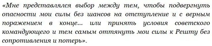 Около 10 часов из Энзели вышел катер с парламентером, капитаном Крэчли. Исаков счел его сотрудником разведки и не без оснований – месяцем ранее Крэчли, прекрасно знавший русский язык, уже вел переговоры с белым командованием об интернировании флотилии. Парламентер требовал прекращения высадки – но теперь уже Раскольников мог ставить условия англичанам, у которых еще год назад находился в плену. Генерал Бэйтмен-Чемпейн докладывал в Тегеран: