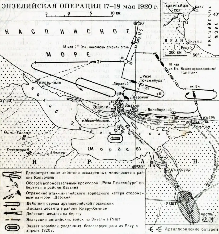 Утром 18 мая из Астары по берегу в сторону Энзели был направлен 7-й Ширванский полк азербайджанской армии и кавалерийский дивизион из состава десантного отряда Кожанова. С моря отряд прикрывал крейсер «Пролетарий», при котором находился транспорт «Греция» с десантной ротой.