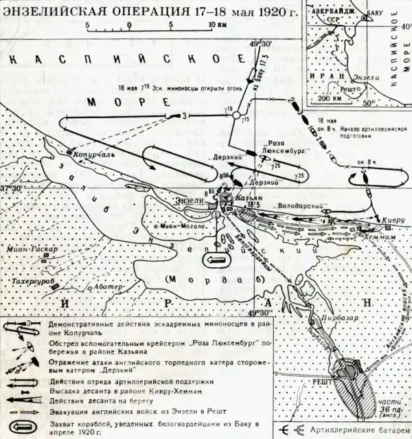 Еще 29 апреля штаб Морских сил Республики предложил Раскольникову проработать операцию с целью окончательного уничтожения белогвардейского флота в Энзели. 11 мая штаб Кавказского фронта запросил у командующего флотилией соображения касательно плана действий против Энзели. 14 мая Раскольников издал приказ о проведении Энзелийской операции. Приказ предусматривал возможность совместных действий с повстанцами Мирзы Кучек-хана – народного героя, фанатика и муджахида, еще в 1915 году поднявшего восстание против правительства в Тегеране. «Его считали спасителем Персии, который выгонит иностранцев и вернет стране ее прежний «золотой век», – писал о Кучек-хане английский генерал Денстервилль.