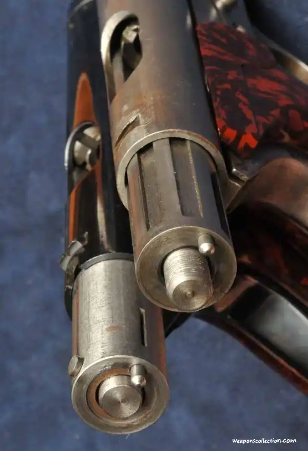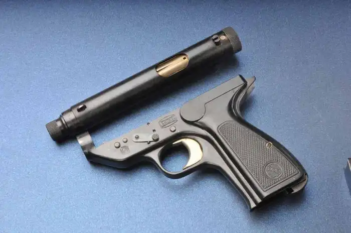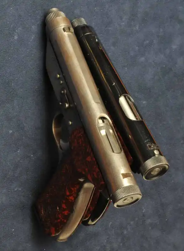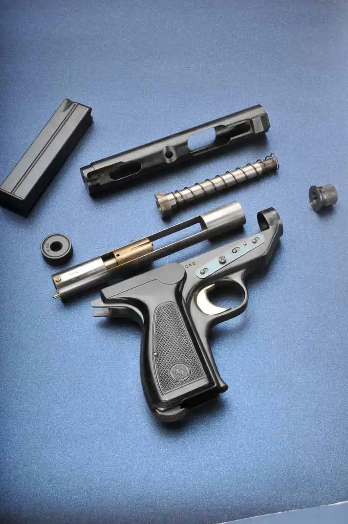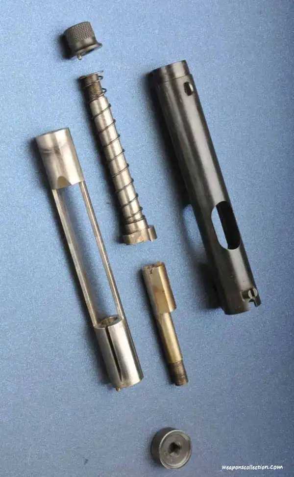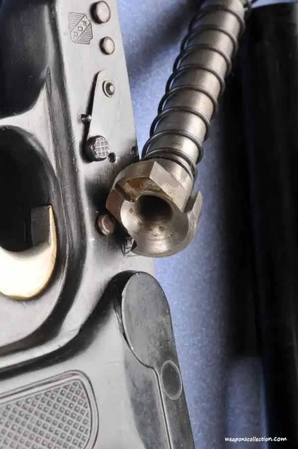 При этом спусковой механизм пистолета находился под стволом. Расположение спускового механизма было обусловлено размещением основных элементов управления пистолетом, а также положительным образом отражалось на габаритах оружия. Пистолетный магазин вставляется внутрь рукоятки, где он фиксировался с помощью подпружиненной защелки, находящейся в нижней части рукояти. Прицельные приспособления на пистолете были открытого типа, нерегулируемые (по сути, в них просто не было необходимости из-за использования оружия на небольшой дальности).