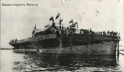 Между крышами этих избушек устанавливался высокий поперечный мостик с перилами и резной будкой посредине, в которой было место лоцмана. Будку покрывали прихотливой резьбой, а иной раз еще и красили «под золото». И хотя беляны были судами «одноразовыми» и сугубо функциональными, их, тем не менее, было в обычае богато украшать флагами, причем не только флагом Российской империи и его торговым флагом, но и личными флагами того или иного купца, на которых чаще всего вышивались изображения святых, от которых таким образом рассчитывали получить благословение. Денег на это не жалели, поэтому они иной раз были так велики, что развевались над белянами подобно парусам. С расходами на них не скупились, потому, что чем не больше флаг, тем выше был «имидж» у купца!