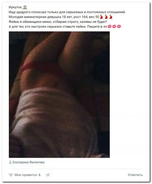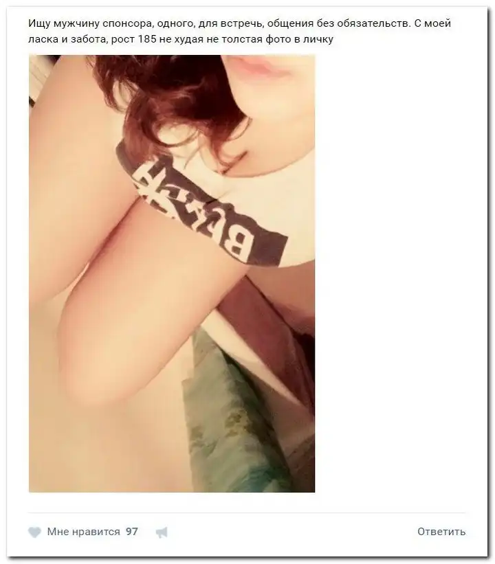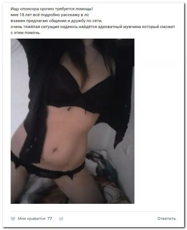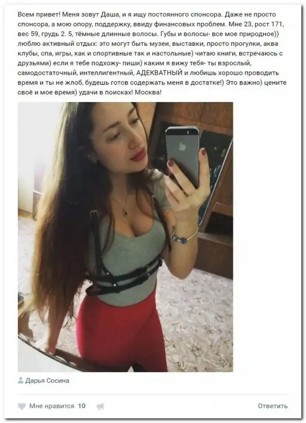 Эти наивные девушки хотят красиво жить и ничего не делать. Они надеются, что богатые спонсоры увидят их красоту, и в очередь выстроятся, предлагая свою помощь. Некоторые даже пишут, что никого интима, им должны заплатить чисто за приятное общение.