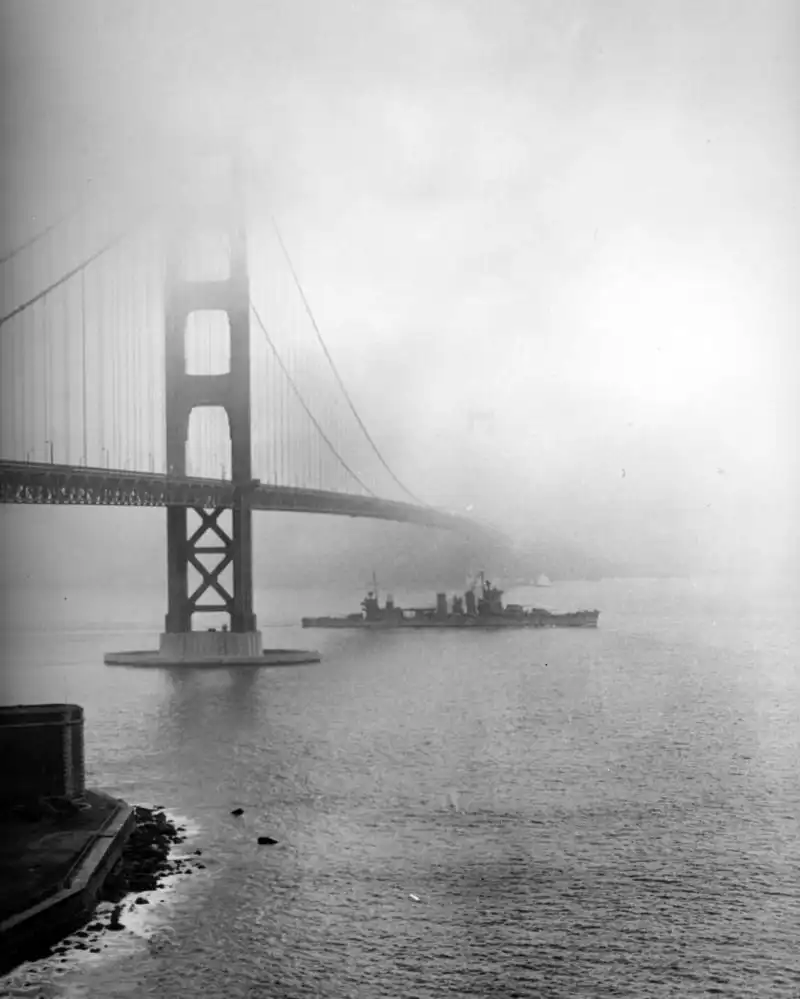 Крейсер проходит под мостом Золотые Ворота по дороге на