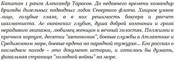 Опять снизились. Видим - летят в воду три здоровенных тюка. Подходим, отрабатывая учения "человек за бортом", поднимаем. В одном - шоколадки, жвачка, леденцы. Во втором - сувениры от экипажа воздушного корабля: нашивки, эмблемы, погоны, все на липучках, и командирская тужурка с орденскими ленточками с личным лейблом "Капитан Грейвс". Это я себе забрал. В третьем мешке - литература. Никакой порнухи, только спортивные журналы и прайс-листы на потребительские товары. Реклама образа жизни, так сказать… Ну, леденцы, жевательную резинку матросам по отсекам раздали. Для многих тогда это в новинку было. Боцман потом ругался, отлепляли эту резину отовсюду… Достаем из одного пакета банку растворимого кофе, к ней записка по-русски, четко так выведено, каллиграфическими буквами: "Одна чашка, два ложка". Это они нас, сиволапых, учили, как заваривать кофе. Честно говоря, обиделись все. Но, как положено, поблагодарили за подарки. Ладно, думаю, придется вам показать, что и мы кофе не лаптем хлебаем. А тут такая ситуация: американские летчики спрашивают, чем они могут нам помочь. Я прошу: "Ребята, дайте мне опасные для нас цели в радиусе десяти миль." "О,кей!"