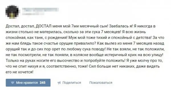 Во «ВКонтакте» есть паблик, где женщины делятся ужасающими историями о желании покончить с собой после рождения ребенка. В каждом анонимном посте — боль, отчаяние, нервный срыв. Я почитал пару постов и волосы встали дыбом. Под катом — больше.