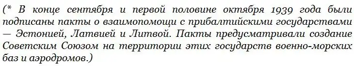 «Исторический опыт недавнего прошлого показывает, что нарушение добрососедских отношений между Советским Союзом и Финляндией каждый раз оказывалось лишь на руку агрессивным кругам империалистических держав, интересы которых не имеют ничего общего с национальными интересами Финляндии»,— говорил в 1957 году Н. С. Хрущев . Именно так и обстояло дело в ноябре 1939 года.
