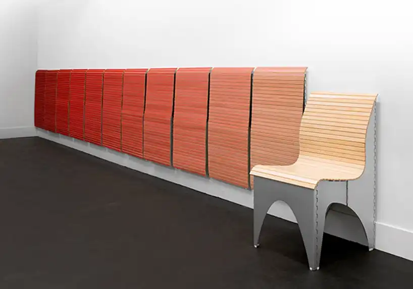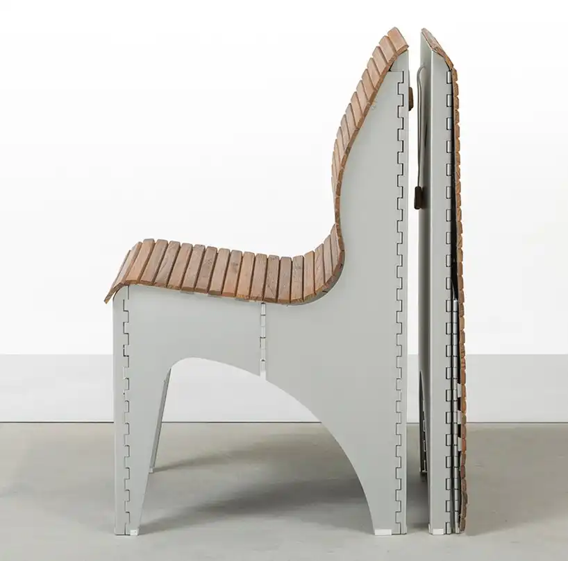 Проект из Нью-Йорка RockPaperRobot представил изящный складной стул Ollie. Стул спроектирован на основе кинетики и складывается легким наклоном. Выполнен из алюминия и деревянных реек.
