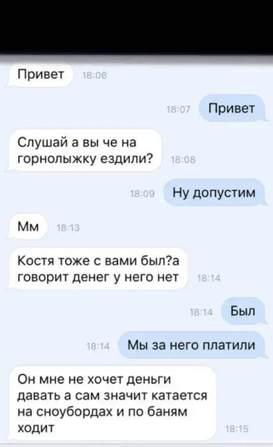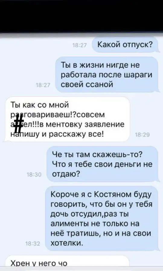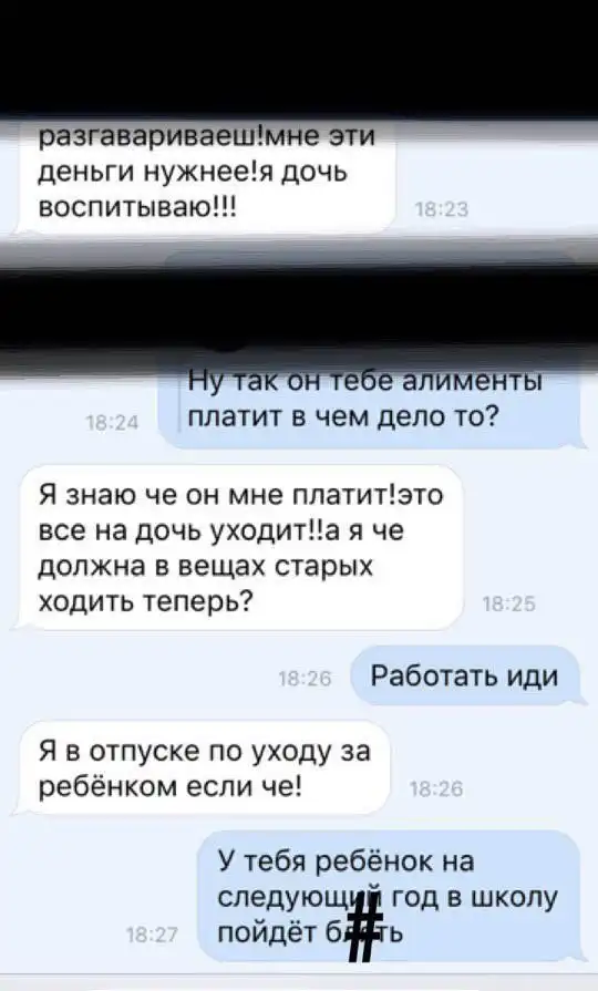 Такая история. Мой друг в разводе, исправно платит алименты, и помимо этого постоянно чем-то помогает своей бывшей жене. Жена алименты частенько просаживает и покупает себе с них всякие вещи. Все об этом прекрасно знают, но друг не может не давать, потому что любит дочь,а бывшая жена этим пользуется. Сейчас у него проблемы на работе, и он не может давать денег сверху. И эта мадам не придумала ничего лучше, чем писать его друзьям. Писала и звонила не одному мне, если получится скину её переписки с другими людьми.