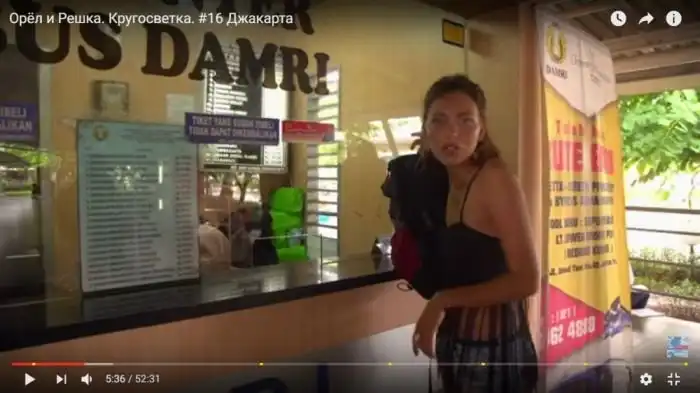 Правда: Как и Регина, мы вышли из терминала, спросили у первого встречного про автобус до центра, и через десять минут уже мчались к центру Джакарты. Есть такой автобус, и не один! Особенно доставляет, что в кадрах ведущая стоит у кассы той самой компании Damri, на автобусе которой мы и ездили до главного ж/д вокзала в центре города.