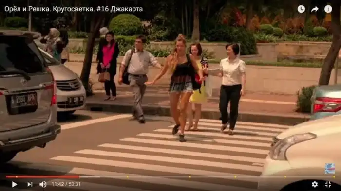 Правда: Конечно, это Азия, и на переходах при появлении пешехода никто не останавливается. Но стоит поднять руку вверх или в протянуть в сторону водителей, как машины даже на многополосной магистрали послушно тормозят без каких-либо бибиканий и нервов, освобождая место для прохода. В отличие, например, от Грузии, где никак невозможно перейти даже четырёхполосную улицу, в Джакарте пешеходу под силу пересечь абсолютно любую улицу или шоссе. Нужно только прочувствовать местную манеру общения водитель-пешеход, что команда «Орла и Решки» в условиях короткого съёмочного времени сделать не смогла.
