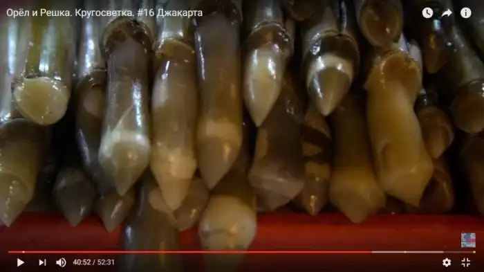 Ложь: «В Джакарте, как и в любом другом городе мира, самая дешёвая еда — уличная». Свой выбор Регина остановила на моллюске, который называют морским черенком. «Выглядит абсолютно непривлекательно».