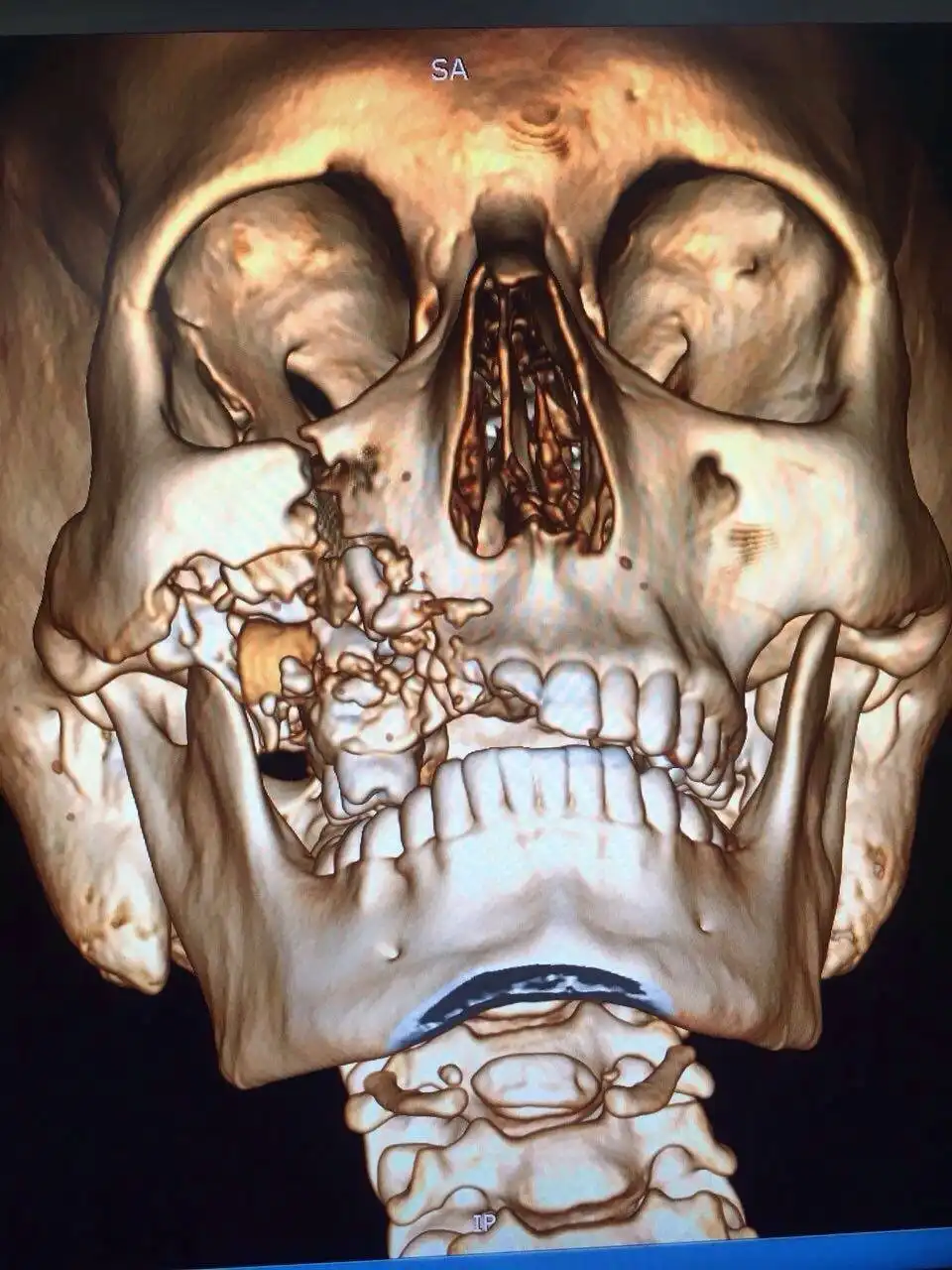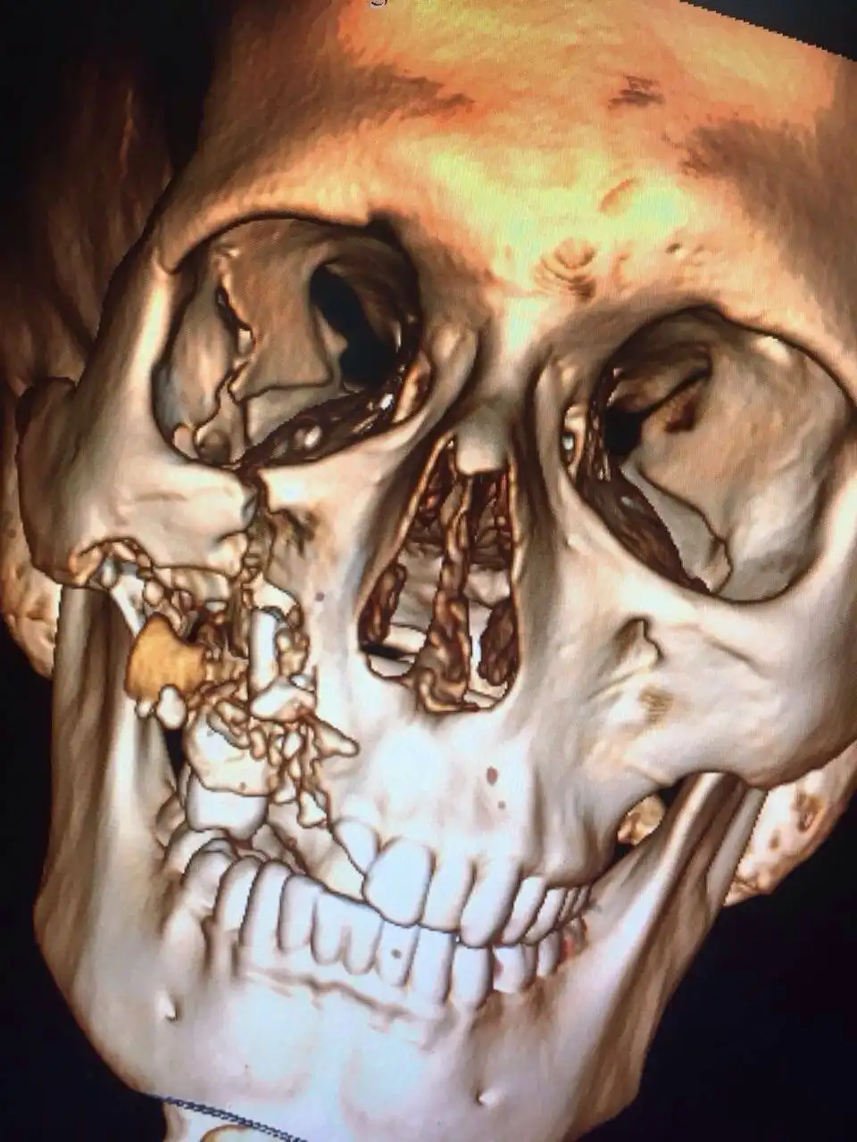Немедленно ребенок был осмотрен врачами-специалистами приемного отделения, проведены все необходимые обследования, включая компьютерную томографию. Подросток в срочном порядке переведен в отделение челюстно-лицевой хирургии. Дежурным челюстно-лицевым хирургом Новиковым Павлом Владимировичем, экстренно, было проведено оперативное вмешательство - первичная хирургическая обработка раны, ревизии и тампонирования правого верхнечелюстного синуса,удаление 1.2. зуба. Назначена комплексная антибактериальная и противовоспалительная терапия. После проведения данной операции, состояние пациента стабилизировалось, местно сохранялся отек и гематома правой половины лица. Была продолжена консервативная терапия и подготовка к плановому этапному реконструктивному хирургическому вмешательству.
