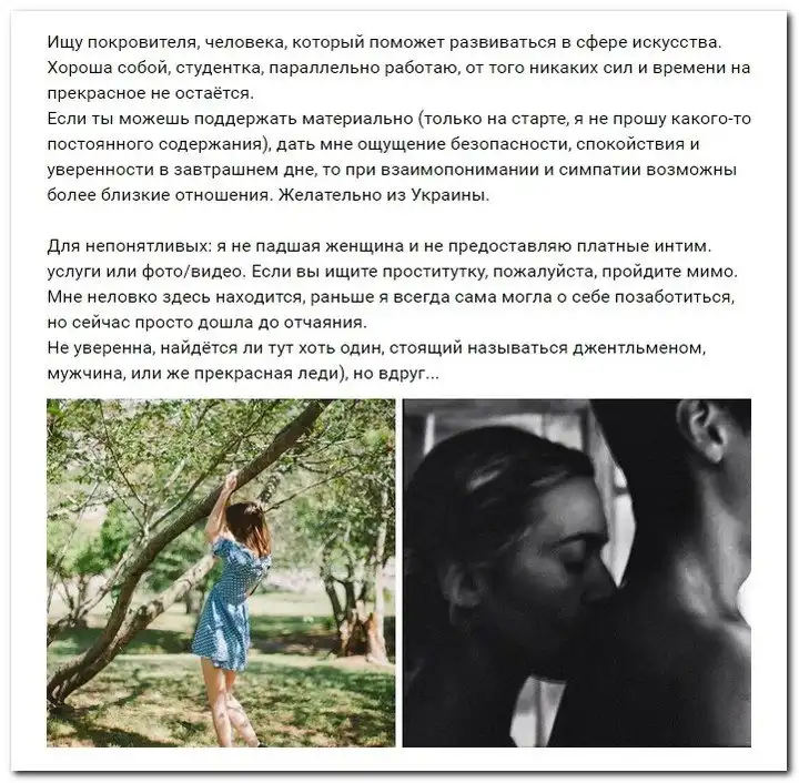 Эти наивные девушки хотят красиво жить и ничего не делать. Они надеются, что богатые спонсоры увидят их красоту, и в очередь выстроятся, предлагая свою помощь. Некоторые даже пишут, что никого интима, им должны заплатить чисто за приятное общение.