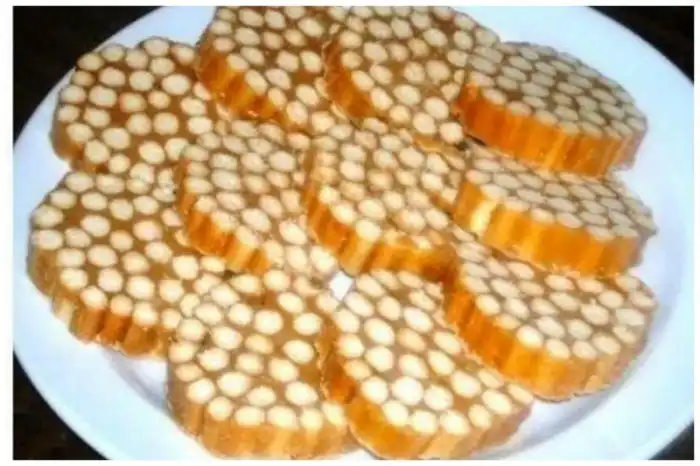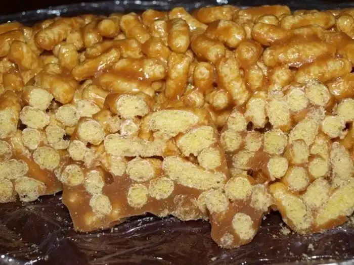 Ириски и сливочное масло, сладкая соломка - первое растопить, перемешать, второе уложить, залить первым, завернуть, в холодильник