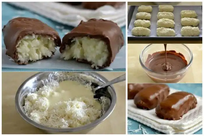 Смешайте кокосовую стружку, немного сливочного масла и сгущенное молоко, сформировать "биточки", выложить на пергамент, залить растопленным шоколадом - в холодильник