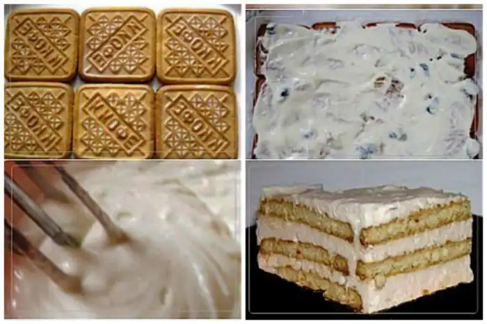 Тортик из детства. Печенье "К чаю/кофе", быстро макнуть каждую печеньку в молоко, выложить квадратом и намазать кремом, слоями - сметана, сахар, творог (фрукты, орешки, шоколад по желанию).