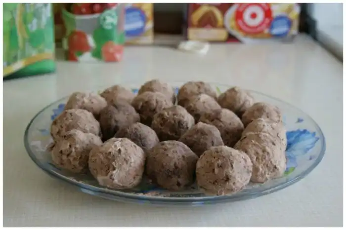 Вкусно!!! Сгущенка (вареная), сливочное масло, орешки, молочная смесь, какао-порошок, шоколад - все смешать, внутрь положить орешек, обкатать в шоколадной/ кокосовой стружке и в холодильник.