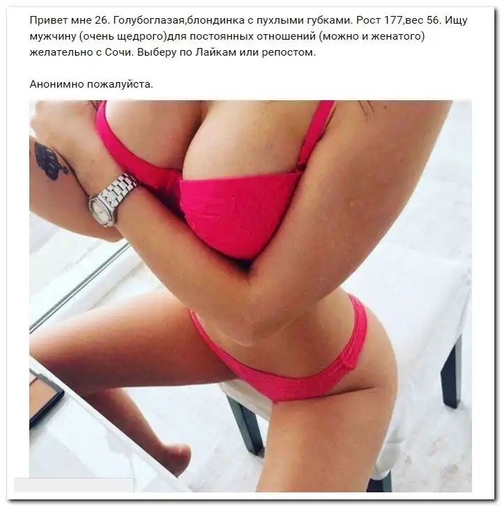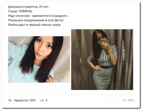 Эти наивные девушки хотят красиво жить и ничего не делать. Они надеются, что богатые спонсоры увидят их красоту, и в очередь выстроятся, предлагая свою помощь. Некоторые даже пишут, что никого интима, им должны заплатить чисто за приятное общение.