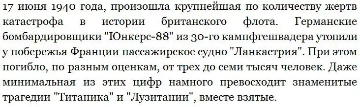 Поняв, что тайное стало явным, британские пропагандистские службы пошли по другому пути и начали преуменьшать количество жертв. Вскоре было издано коммюнике, в котором говорилось, что на "Ланкастрии" погибло примерно три тысячи человек. Этой цифры официальный Лондон придерживается до сих пор, хотя независимые исследователи уверены, что она занижена, по крайней мере, вдвое.