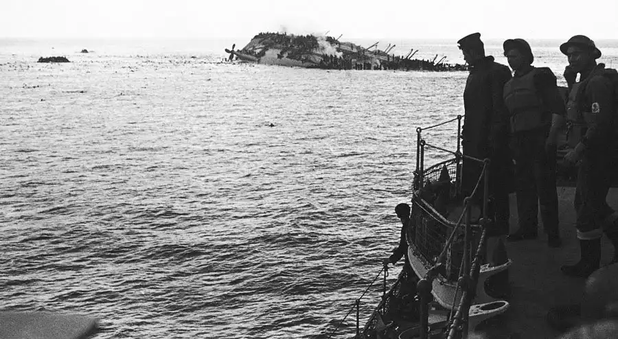 Перегруженный сверх всякой меры корабль вышел из порта на внешний рейд, и тут капитан решил задержаться, чтобы подождать подхода эскортных эсминцев, которые должны были защищать судно от атак германских самолетов и подводных лодок. Эта задержка стала роковой. Через два часа на горизонте появились не английские эсминцы, а немецкие бомбардировщики.