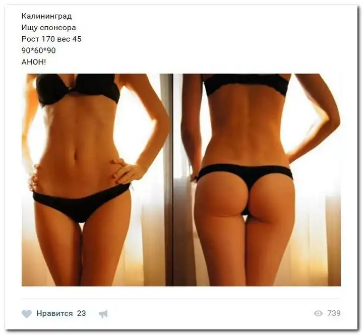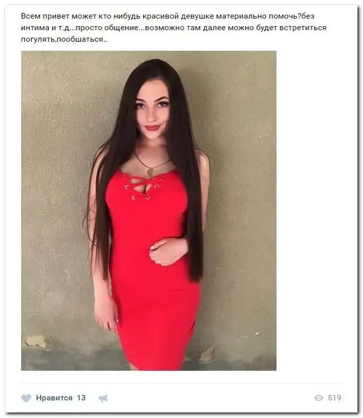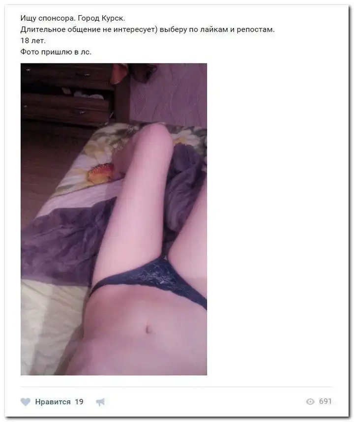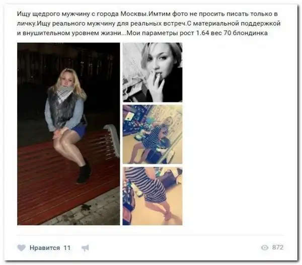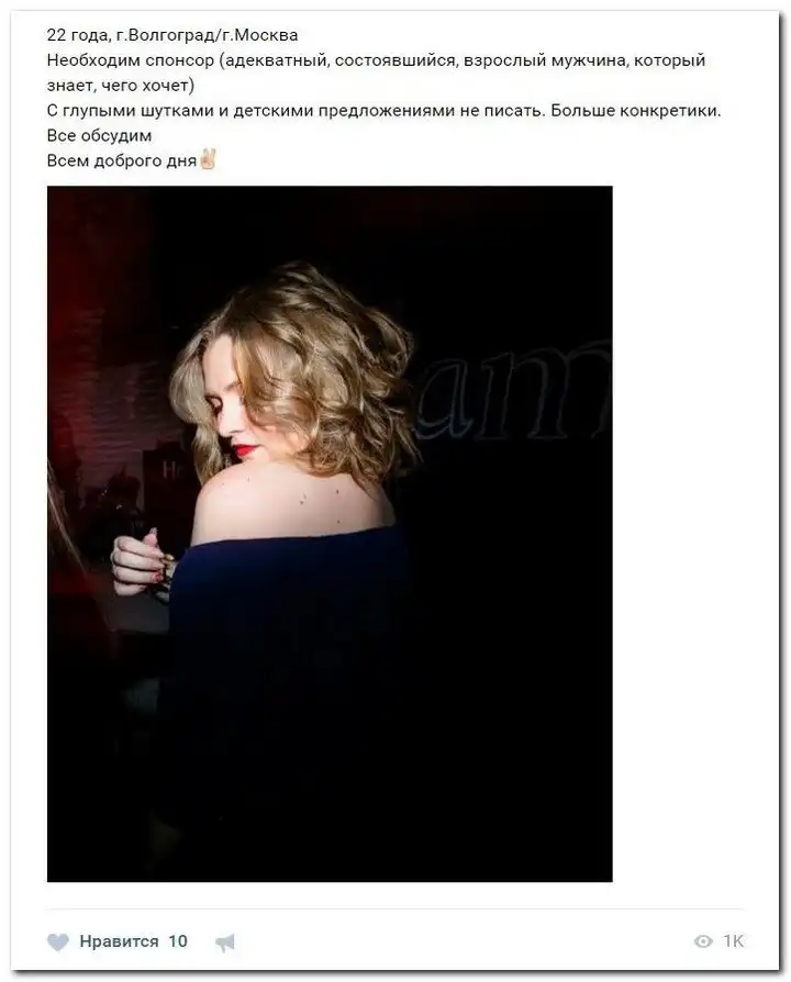 Эти наивные девушки хотят красиво жить и ничего не делать. Они надеются, что богатые спонсоры увидят их красоту, и в очередь выстроятся, предлагая свою помощь. Некоторые даже пишут, что никого интима, им должны заплатить чисто за приятное общение.