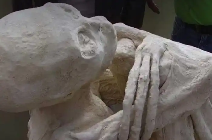 Мумия представляет собой странное трехпалое существо с длинным черепом, огромными глазами и тщедушным телом. Кто-то считает, что это подделка, мастерски выполненная из гипса, однако есть и те, кто утверждает, что найденная мумия - это останки пришельца.