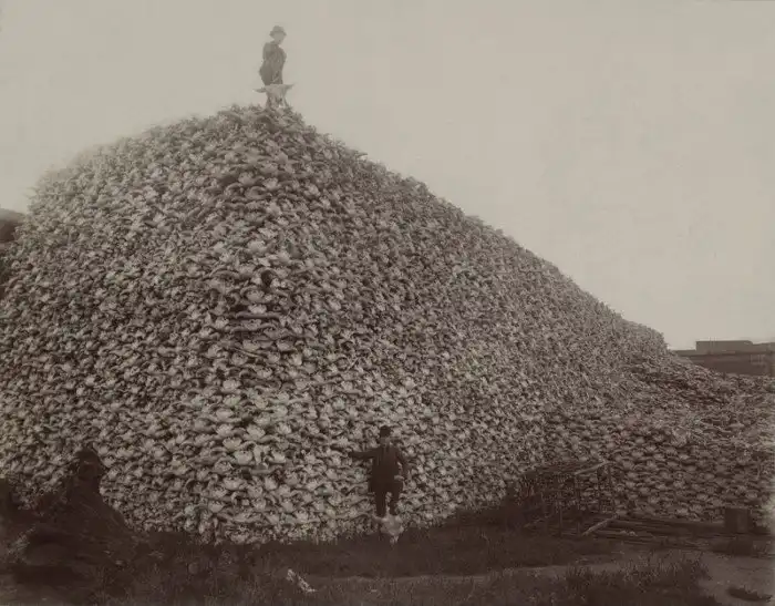 Жуткая бесконтрольная массовая охота на бизонов, которая началась в 1830-х годах и чуть было не привела к полному исчезновению этого вида животных во всей Северной Америке. Традиционно бизоны были одними из самых важных животных, обеспечивающих выживание многих индейских племён. Индейцы охотились на них для пропитания, изготовления одежды, жилища, орудий и утвари. Но убивали всегда ровно столько, сколько нужно для удовлетворения своих жизненных потребностей. Но белые американские охотники и железнодорожные компании начали хищническое истребление бизонов в основном ради шкур для снабжения армии и отправки их в Европу. Если в начале 1800-х годов убивали около 200 тысяч бизонов в год, то в период с 1870 по 1875 год ежегодно убивали примерно 2,5 миллиона бизонов. В результате численность бизонов сократилась с 30 миллионов в 1800 году до менее тысячи к концу века.