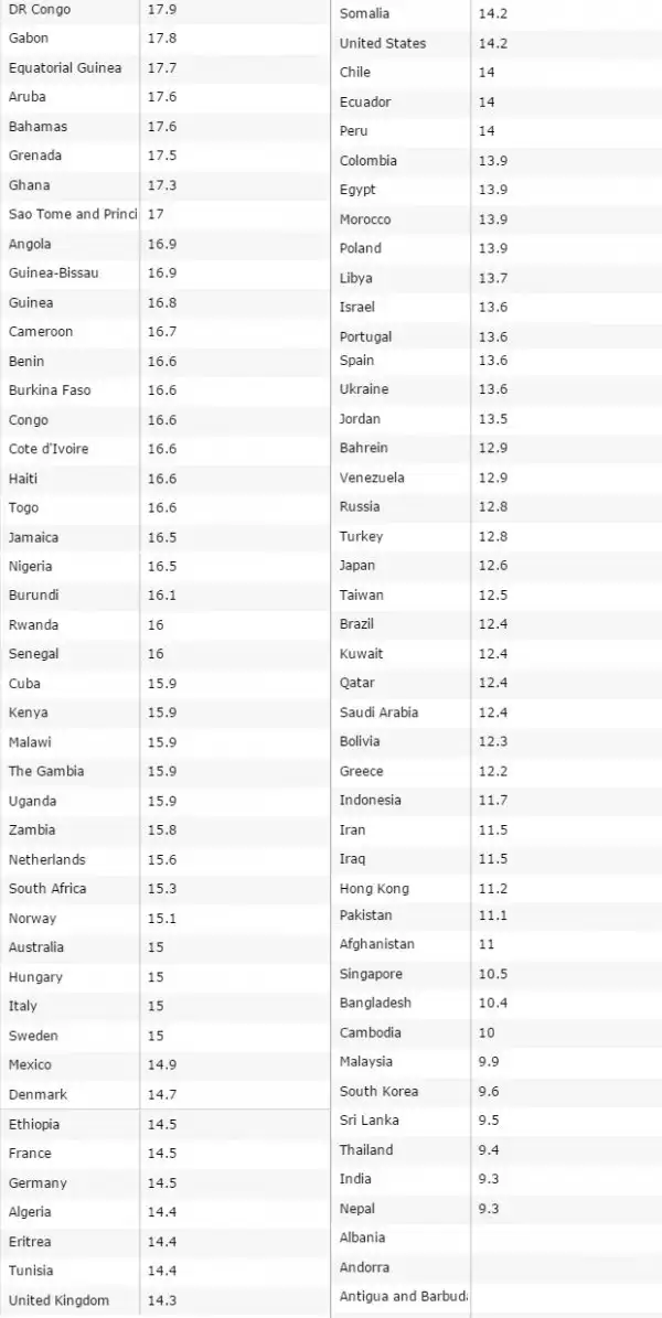 Самые маленькие пиписьки на планете в Индии (9,3 см), Непале (9,3 см), Таиланде (9,4 см), Шри-Ланке (9,5 см), Южной Корее (9,6 см), Малайзии (9,9 см), Камбоджа (10 см), Бангладеш (10,4 см).