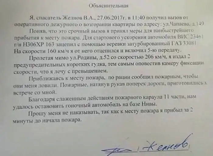 В Центр гражданской защиты города Тольятти пришел штраф из ГИБДД, в котором говорилось о том, что камера зафиксировала, что служебный автомобиль "Нива" двигался со скоростью 206 км/ч. Сверхбыстрая машина спасателей была замечена на улице Родины в центре города, сумма штрафа составляла 5000 рублей. В ведомстве решили провести проверку и от водителя, отрабатывавшего тот вызов, потребовали объяснительную, которая оказалась настоящим шедевром.