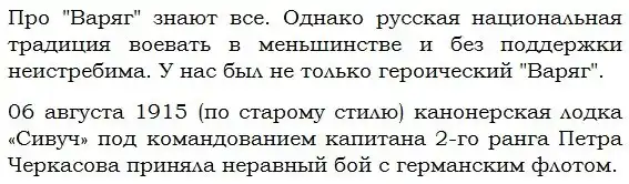 Героически сражавшийся под командованием капитана 2 ранга П.Н. Черкасова, “Сивуч” в 32-минутном бою нанес повреждения крейсеру и эсминцу, но был расстрелян с близкого расстояния. Превратившись в костер и погружаясь в воду, русский корабль продолжал вести огонь из единственного уцелевшего 75-мм плутонгового орудия мичмана М. Мурзина. В 21 час 30 минут лодка перевернулась и, окутавшись паром, ушла под воду.