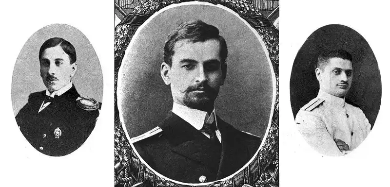 (в центре), мичман И.И. Тырин (слева) и мичман Б.М. Шредер (справа)