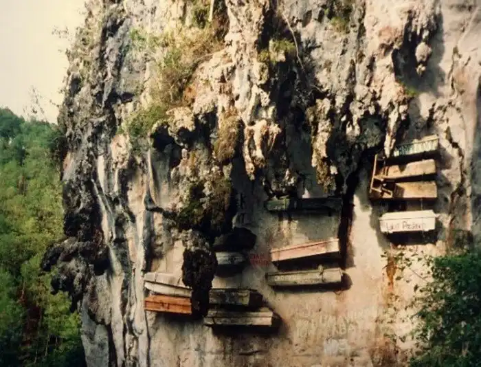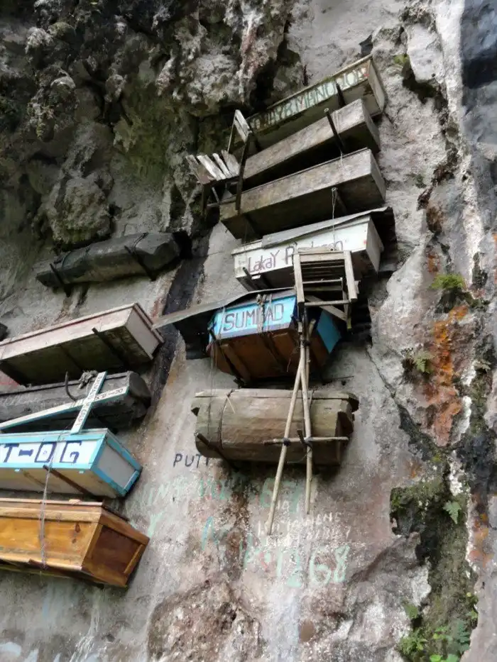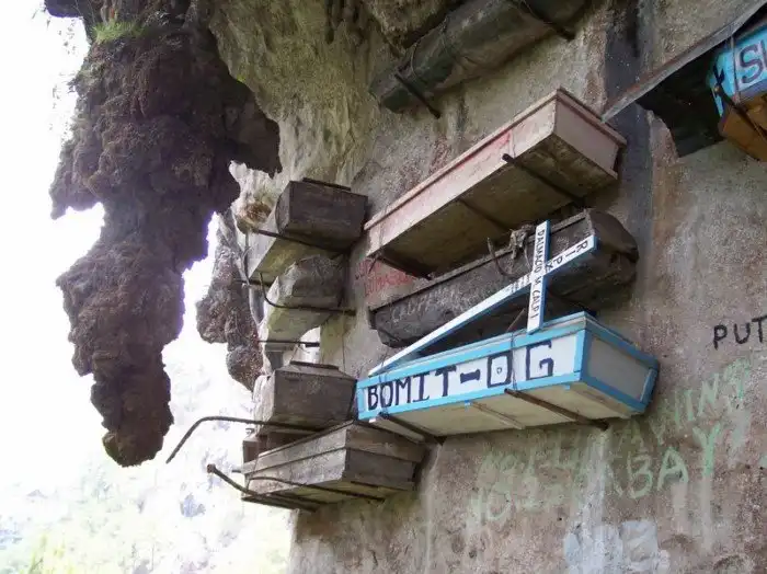 В Филиппинах жители горной провинции Сагада уже на протяжении двух с лишним тысяч лет хоронят своих умерших в так называемых “висячих гробах”. С помощью верёвок деревянные гробы закрепляют высоко над землёй на известняковых скалах. Среди коренного населения считается, что чем выше тело умершего захоронено, тем ближе его душа к небесам. Сегодня это место известно под названием “висячие гробы Сагады”.