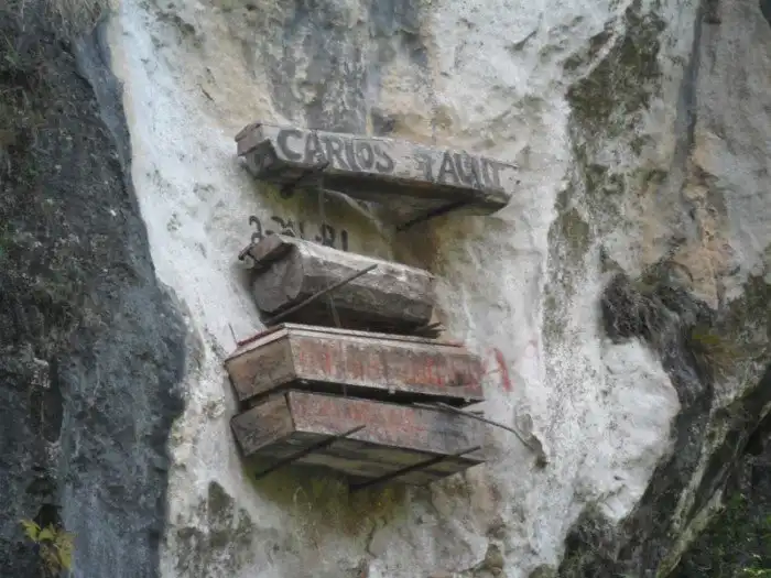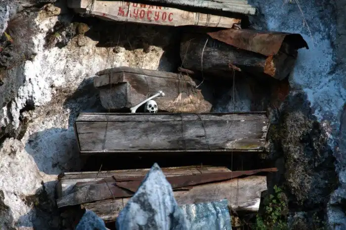 Практически все скалы Сагады увешаны десятками, а то и сотнями гробов. По традиции каждый житель провинции должен заранее приготовить для себя гроб.