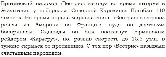 Через двое суток в Атлантике, на 37 градусе 35 минутах северной широты и 71 градусе 08 минут западной долготы, «Вестрис» затонул. Это случилось в одном из оживленных районов судоходства, и хотя в спасении парохода принимали участие десятки судов и береговых радиостанций, люди оказались бессильны перед стихией. В Англии и США было назначено официальное расследование. Чтобы выяснить причины этой катастрофы, суду потребовалось провести 40 заседаний. Во время следствия, которое проводилось в США, один американский морской эксперт, анализируя действия капитана «Вестриса», заявил, что они представляют собой «сочетание предельной глупости с вопиющей безграмотностью». Из 37 женщин и 12 детей, находившихся на борту лайнера, не спасся ни один ребенок, и в живых осталось только 8 женщин. Капитан Карей погиб вместе со своим судном, и фактически всю вину судьи как в Англии, так и в США возложили на него.