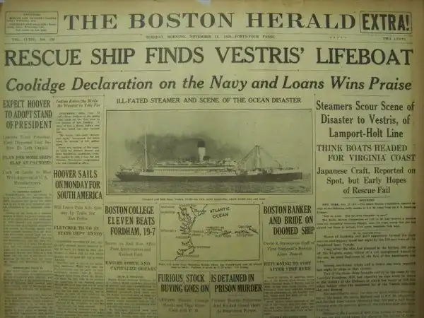 В 6 часов утра спущенный с линкора «Вайоминг» вельбот спас с воды 9 человек, которые держались за обломки корабля. «Берлин» поднял на борт американца из Чикаго Карла Шмидта, который провел в воде без нагрудника 22 часа. Когда подсчитали число спасенных с «Вестриса», выяснилось, что катастрофа унесла 159 человеческих жизней. Официальное расследование причин катастрофы началось 22 апреля 1929 года. Оно проводилось в здании Королевского общества инженеров-строителей в Лондоне под председательством комиссара морских аварий Батлера Колла Эспинала. Ему помогали 5 экспертов по вопросам судостроения и мореплавания. Следственную комиссию интересовали в этом деле даже самые незначительные на первый взгляд детали и подробности. Например, в судебных протоколах фигурировала такая цифра, как 237249 фунтов 15 шиллингов и 2 пенса — стоимость постройки лайнера в 1912 году. Кроме того, выяснились некоторые обстоятельства, предшествовавшие гибели судна. В первом пункте перечня причин гибели «Вестриса», объявленного 31 июля 1929 года Королевским юридическим судом Великобритании, написано «Перегрузка судна выше его грузовой марки на семь дюймов». Оказалось, что «Вестрис» не первый раз покидал Нью-Йорк с осадкой больше расчетной.