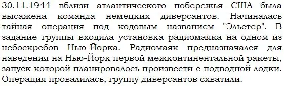 В январе 1945 года рейхсминистр вооружений и военного производства Германии Альберт Шпеер заявил, что крылатые ракеты «Фау-1» и «Фау-2» «обрушатся на Нью-Йорк 1 февраля 1945 года», что усилило озабоченность правительства США угрозой возможного нападения. Однако, фактически, в связи с тем, что уже на территории Германии велись боевые действия, немцы не успели воплотить в жизнь устройства для запуска ракет с подводных лодок.