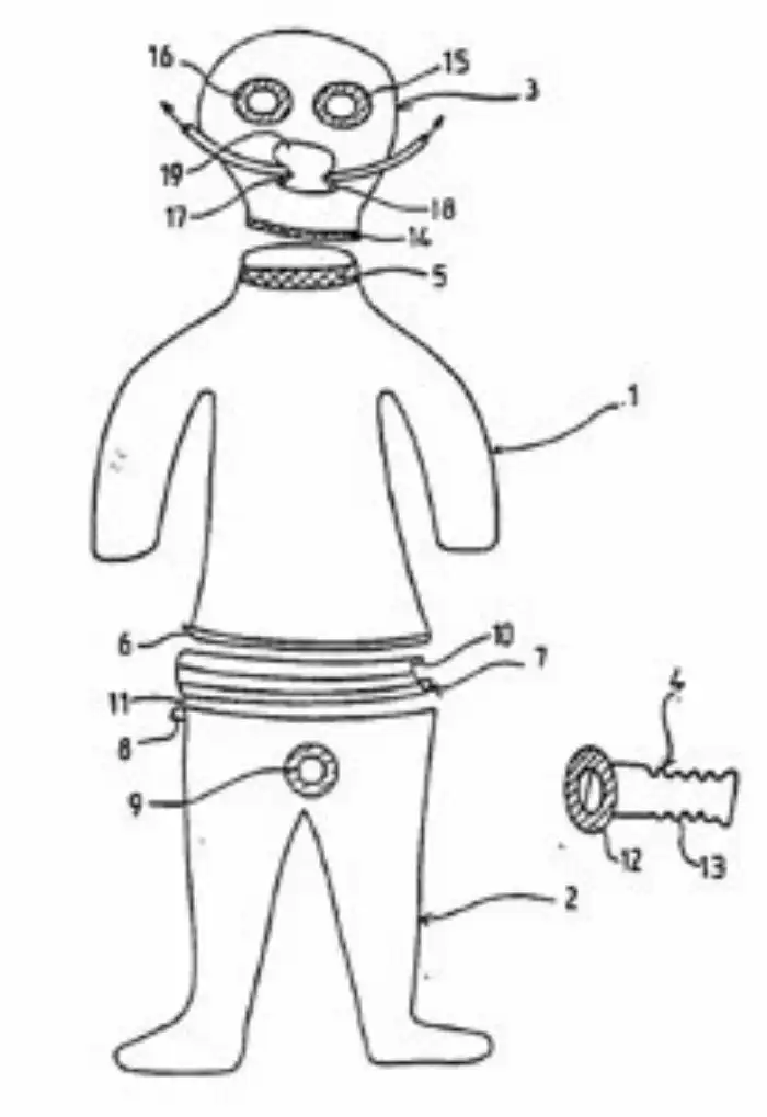 «Настоящее изобретение специально предназначено для защиты пользователя от заболеваний, передающихся половым путем. Изобретение состоит из внешнего костюма, изготовленного из полимерного материала, предпочтительно прозрачного латекса, и отдельного элемента 4, который надевается на мужской половой орган и крепится к костюму при помощи элемента 9». Собственно, этого вполне достаточно, чтобы составить представление о фетишистских прокольчиках изобретателя «защитного костюма».