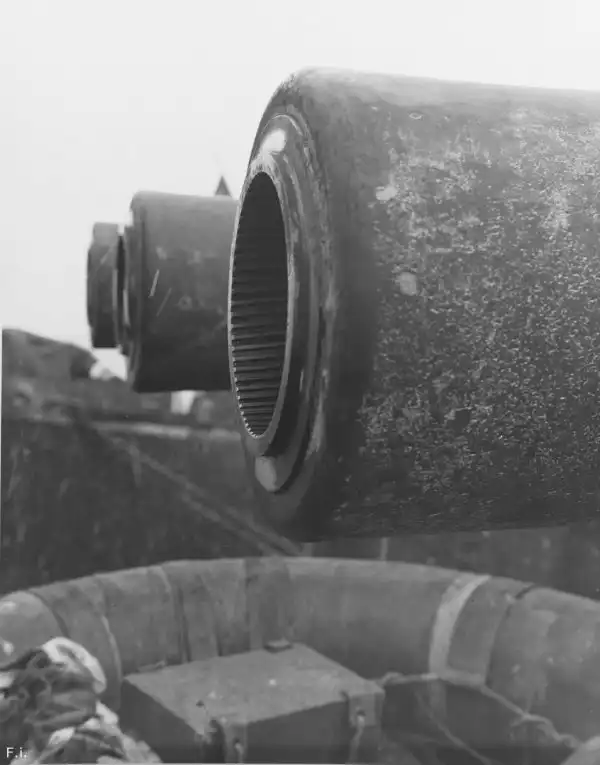 Заметно как вылезли лейнеры и обгорела краска на стволах. За четыре часа боя Свэйбэк Мару выпустил 832 снаряда ГК-это две трети всего боезапаса, причем большая часть выстрелов пришлась на кормовую группу башен,отчего бронебойные снаряды там закончились, их пришлось подавать вручную из носовых погребов.