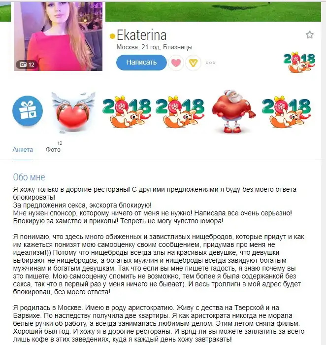 Написала мне тут аристократка с Барвихи на сайте знакомств, до сих пор ржу, и глаз дергается)Сижу я значит мирно болтаю с прекрасной девушкой Асей, и тут........аристократка с Барвихи заинтересовалась, зачем это я нищеброд раза три ее анкету топтал??...Читайте ее анкету, весьма занимательно, и лично мне ее жалко, но не сильно) А чуть позже внезапно написала Флора Майской Розы, видать ее лучшая подруга)))