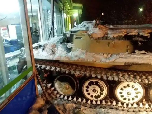 В городе Апатиты Мурманской области легкобронированный гусеничный тягач МТ-ЛБ врезался в магазин. Инцидент произошел рано утром, а его виновником стал местный житель, угнавший тягач из автошколы ДОСААФ. Не справившись с управлением, мужчина повредил припаркованный автомобиль ВАЗ, после чего врезался в магазин. Покинув место ДТП, виновник украл бутылку вина, с которой позже его и задержали сотрудники полиции.