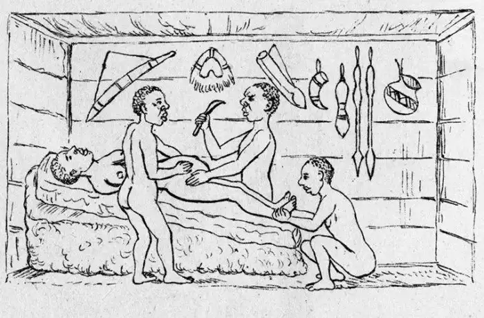 Еще в XIX веке операция кесарева сечения в племенах Центральной Африки выглядела так, будто ее проводят неандертальцы. Английский врач и путешественник Роберт Фелкин стал свидетелем одной из таких «процедур», о чем и написал в одной из своих книг. Роженицу поили банановым вином (им же мылись руки «хирурга»-мужчины и его помощников, а также низ живота женщины), а потом клали на наклонную доску. «Акушер» издавал громкий крик, который подхватывала собравшаяся вокруг хижины-родильни толпа. После чего живот несчастной разрезался от лобкового сочленения почти до пупка. И пока хирург доставал ребенка, один из его ассистентов прижигал раскаленным железом кровоточащие места. Затем пациентку переворачивали на бок, чтобы вылить всю жидкость из брюшной полости. Только после этого края раны «зашивали» при помощи… семи тонких гвоздиков и ниток. Оставалось совсем немного — тщательно разжевать корешки (какие именно — история умалчивает) и выплюнуть эту смесь в горшок, а потом нанести на рану. Сверху «закрепить» все нагретым банановым листом.
