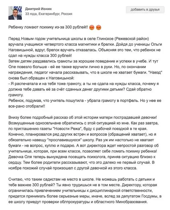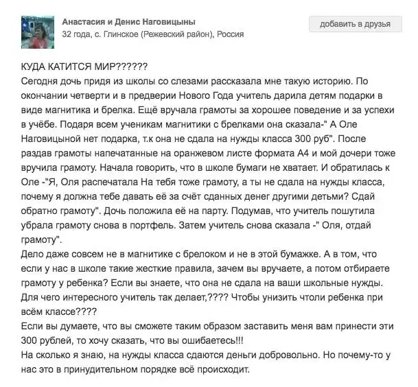 О данной ситуации стало известно благодаря матери ученицы Анастасии Наговицыной
