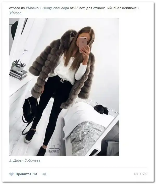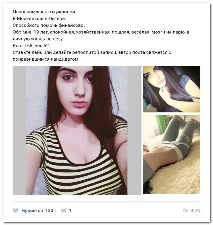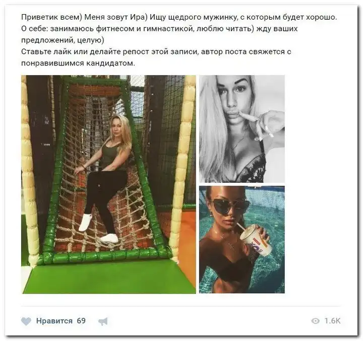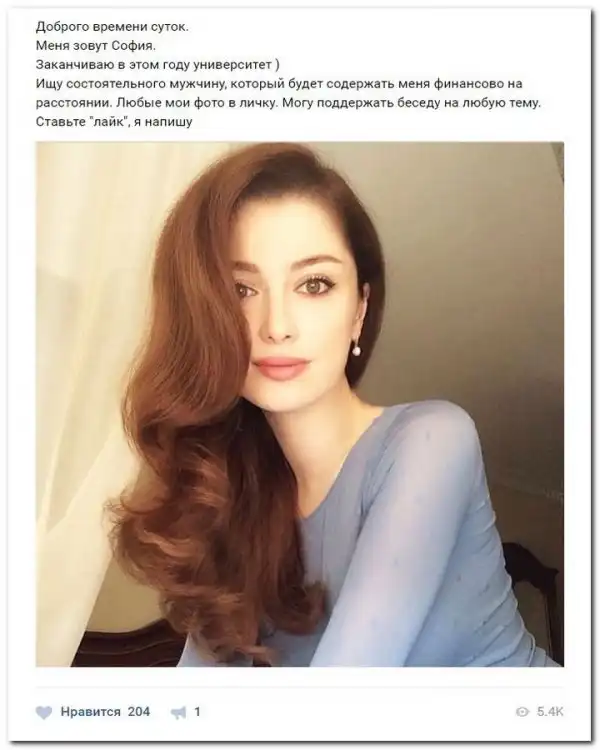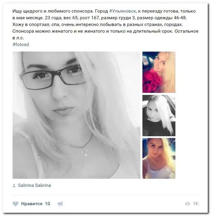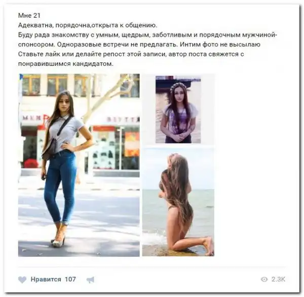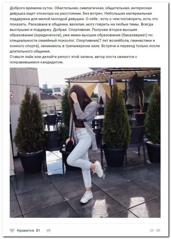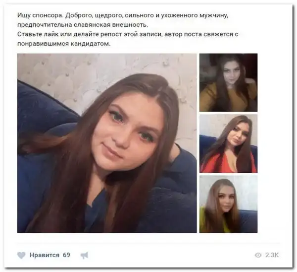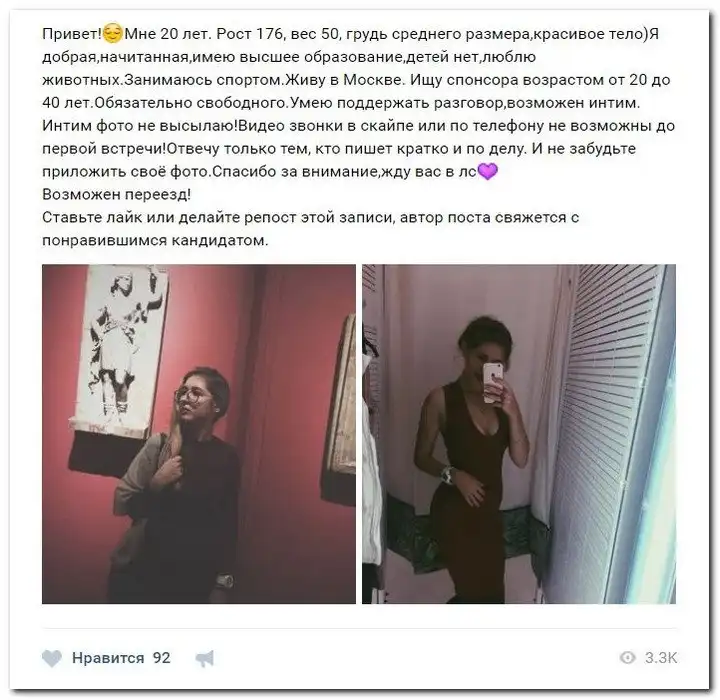 Эти наивные девушки хотят красиво жить и ничего не делать. Они надеются, что богатые спонсоры увидят их красоту, и в очередь выстроятся, предлагая свою помощь. Некоторые даже пишут, что никого интима, им должны заплатить чисто за приятное общение.