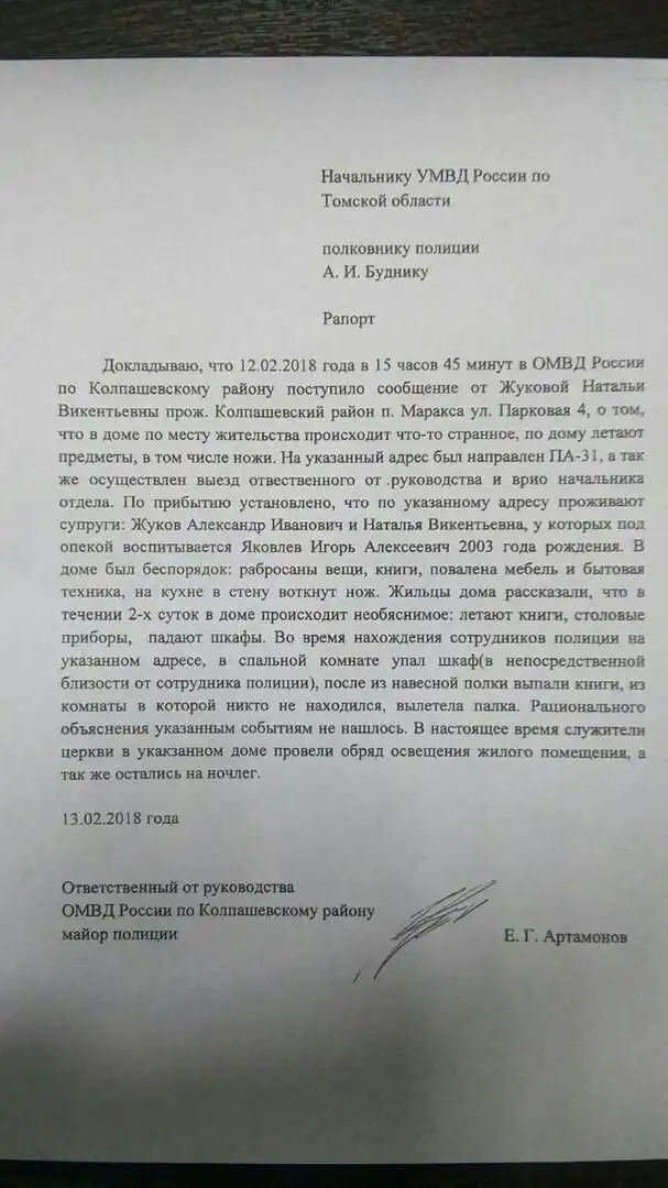 Вскоре в сети появился скрин полицейского рапорта от сотрудника Артаманова. В документе мужчина подтверждает слова очевидцев. Более того, он уверяет, что вещи летали даже в его присутствии. Помимо этого, в другой комнате начали падать книги, и свалился шкаф. Решали странную проблему посредством слова божьего. В жилище был вызван священник, который освятил комнаты и остался на ночевку. Жильцы вынуждены были выехать на неопределенное время. МВД Томской области на официальном уровне подтверждает факт проведения данной проверки. Подлинность рапорта от полицейского пока не подтверждена.
